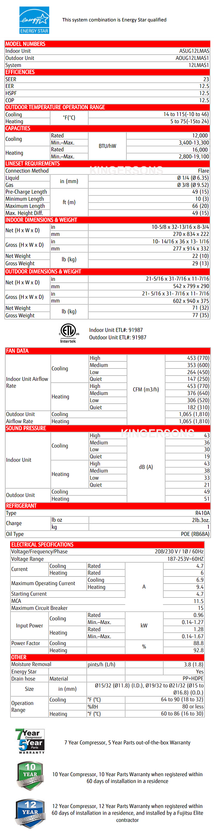 Product Name : Fujitsu 12000 BTU Ductless Mini Split 23 SEER, Single-Zone AC & Heat ENERGY STAR ~ ASUG12LMAS AOUG12LMAS1