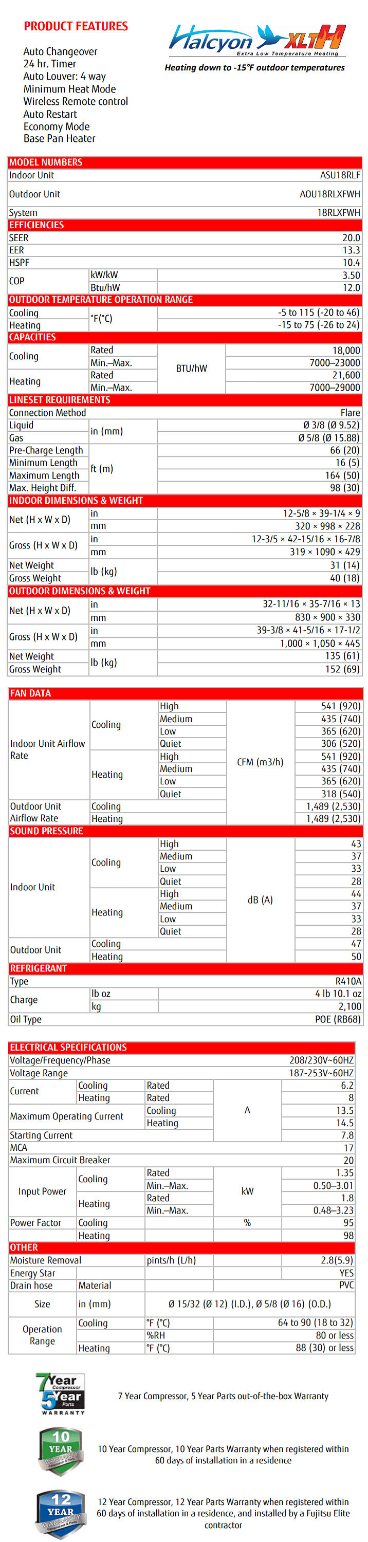 Product Name : Fujitsu - 18,000 BTU Cooling Heating - RLXFWH XLTH Series Wall Mounted Air Conditioning System - 20.0 SEER HYPER HEAT SYSTEM