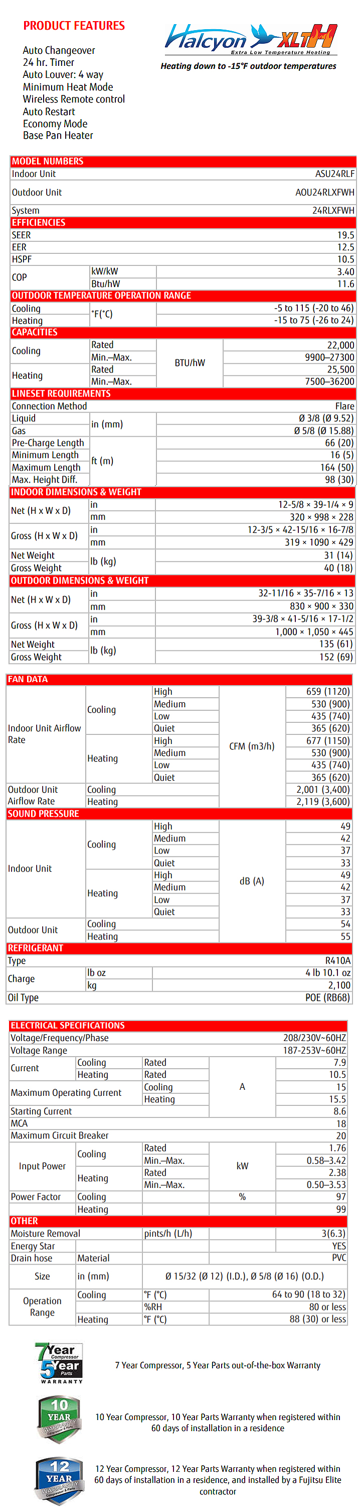 Product Name : Fujitsu - 24,000 BTU Cooling Heating - RLXFWH XLTH Series Wall Mounted Air Conditioning System - 19.5 SEER HYPER HEAT SYSTEM