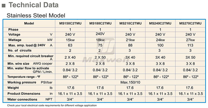 Product Name : MAXWELL 21kw 220V/240V MS210C2TMU STAINLESS STEEL