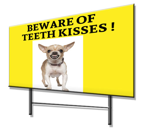 • Signs read:"BEWARE Of Teeth Kisses ! " . The Most unique way to alert people never this has been done before like this. PATENT PENDING.
