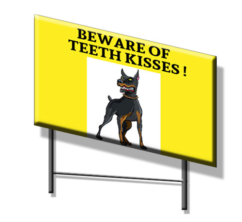 • Signs read:"BEWARE Of Teeth Kisses ! " . The Most unique way to alert people never this has been done before like this. PATENT PENDING.
